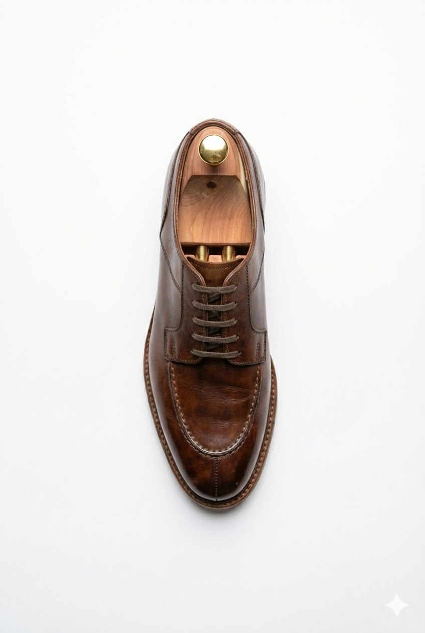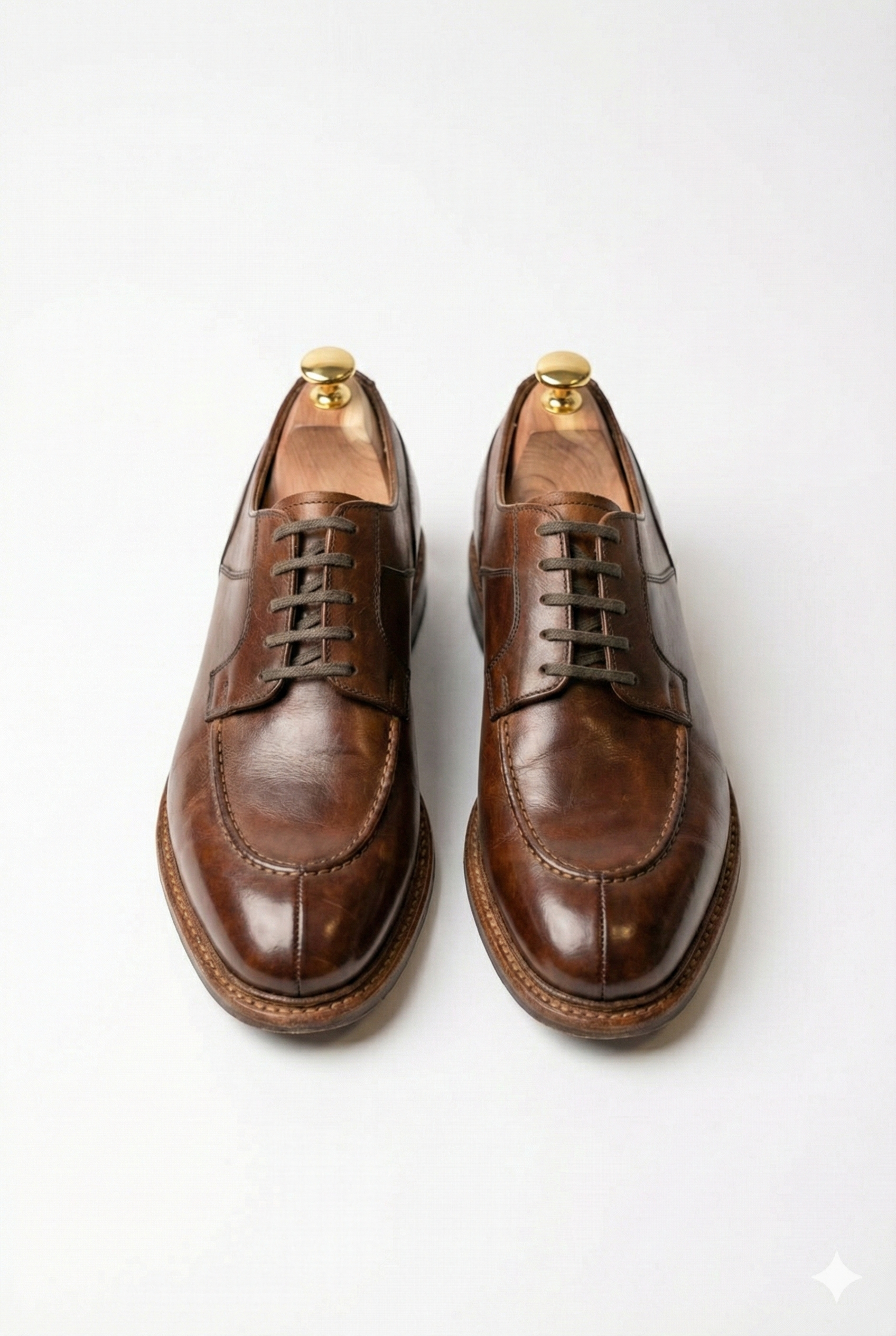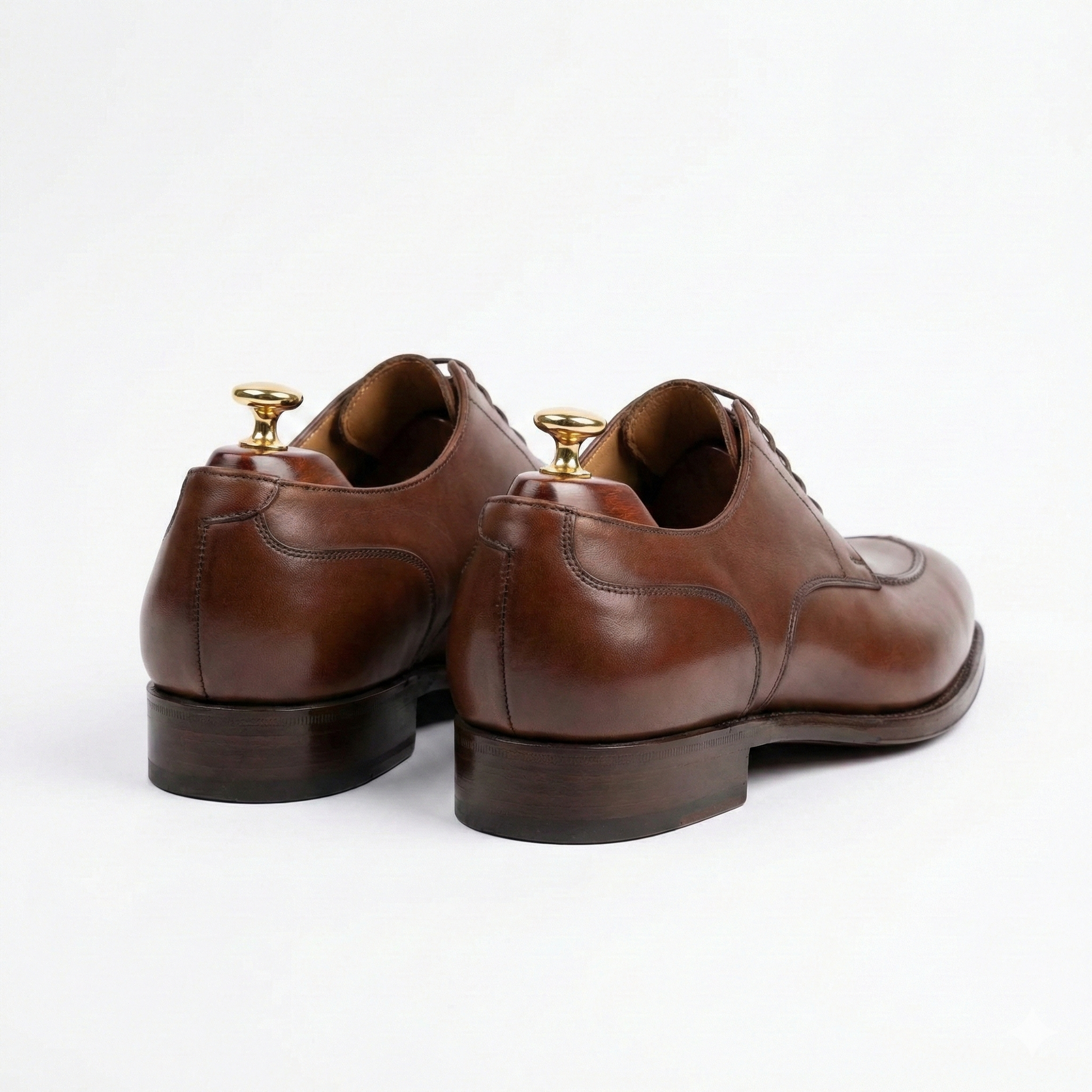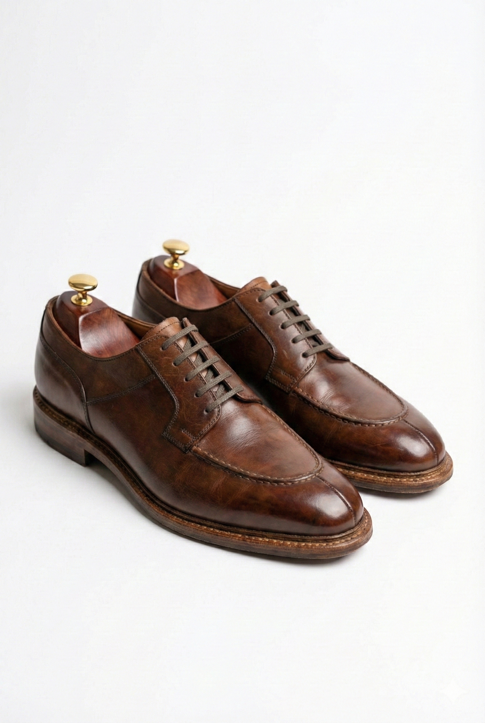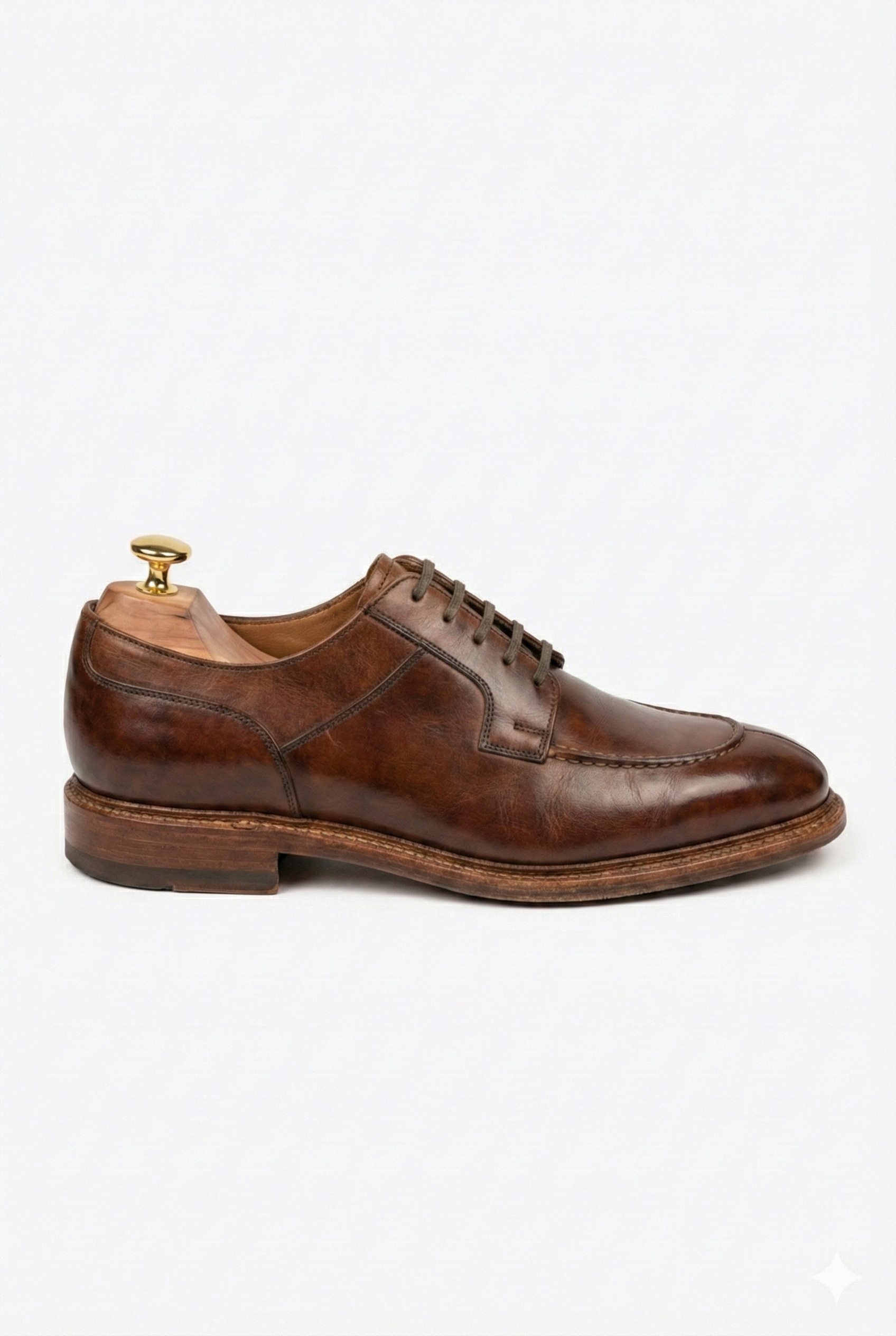 The Norwegian Split-Toe Derby is expertly handcrafted from premium full-grain calfskin leather, offering a supple feel and enduring quality. Its striking profile is defined by a meticulously hand-stitched apron and a classic split-toe design that exudes modern executive elegance. The rich, hand-burnished cognac brown finish provides a deep, multi-tonal patina that develops unique character over time. A fully lined, breathable premium soft leather interior ensures unparalleled all-day comfort and a tailored, glove-like fit. Grounded by a commanding, hand-finished welted leather sole, this silhouette seamlessly merges robust durability with sartorial prestige.